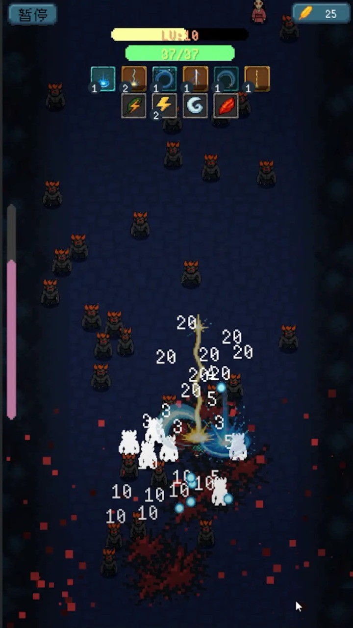 感受真正的“割草”快感!成百上千的像素风恶鬼将从四面八方向你涌来,你需要运用灵活的走位和范围剑技在鬼潮中穿梭求生。
