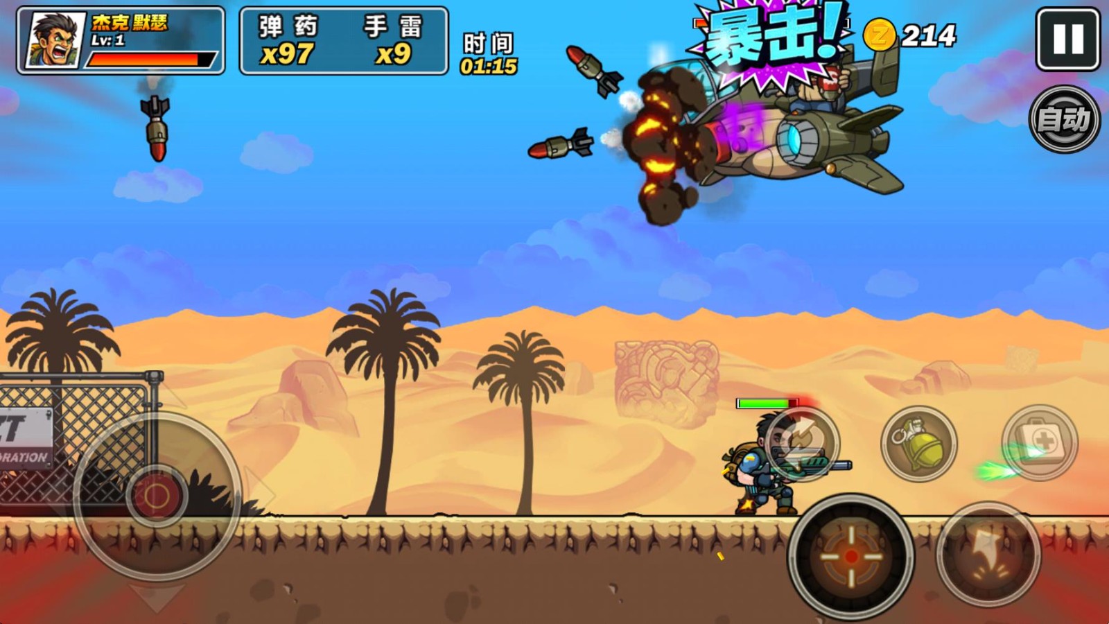 4、正式开始后左边控制角色的移动,右边是射击、跳跃、使用手雷和道具按钮。