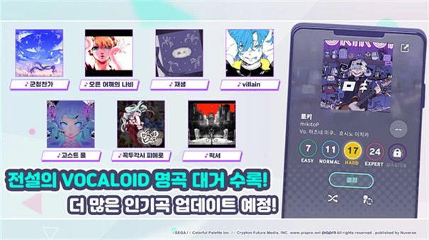 节奏游戏采传统的下落式玩法,并设有五种不同难度。初收录曲共有28首,在游戏正式开始配信后更会在20天内每天公开新曲,当中不乏经典Vocaloid 名曲,像是《Just Be Friends》、《初音未来的消失》、《メルト》等等。