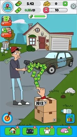 1、点击积累财富:持续点击屏幕即可获得金币,用于升级与投资。
