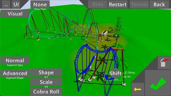 3、高自由度建造系统,可逐段铺设轨道、设计过山车角度,从零开始打造专属过山车,满足创意设计需求。