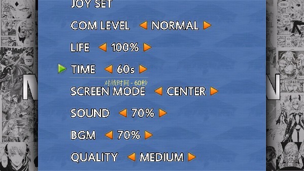 2、其中可对游戏内的对战时间、血量、操作方式等各项内容进行自定义的设置