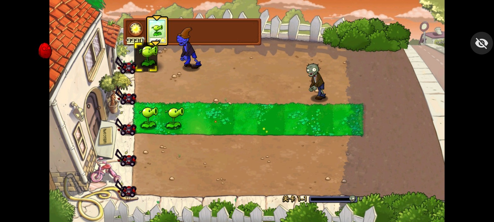 1、来到关卡中,选择左上角的植物图标,比如豌豆射手,再点击草地,就能直接种植。