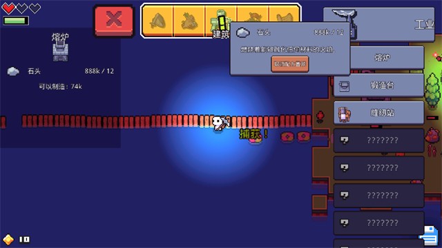 6、收集到足够石头后,回菜单→建筑,选熔炉并选位置,点击【√】确认建造。