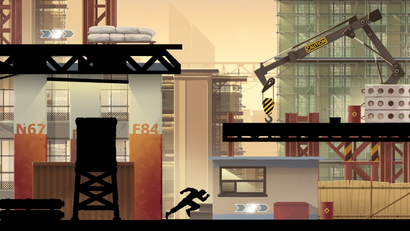 5、首先注意,主角现在这个位置的后面是一段加速的路,路的尽头是一个墩,也就是图中最左边那一点点高的东西(截图不完整),在这段路加速后差不多到墩的时候要向左划一下屏幕减速,然后跳刀墩上再起跳(图中的动作),去到前面那个人那段路,大概到那块公告牌的位置,向下划一下屏幕去到这关的第二个隐藏场景。