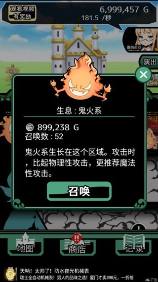 3.召唤并培养各种可爱或凶猛的怪兽,提升它们的战斗力。怪兽会自动出征讨伐魔王,胜利后带回大量金币和资源。