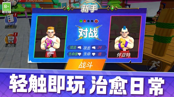 1.疯狂点击屏幕进行举重、沙袋训练或拳击对打,每一次点击都伴随清晰的挥拳动画、打击音效和力量数值跳动,手感直接爽快。