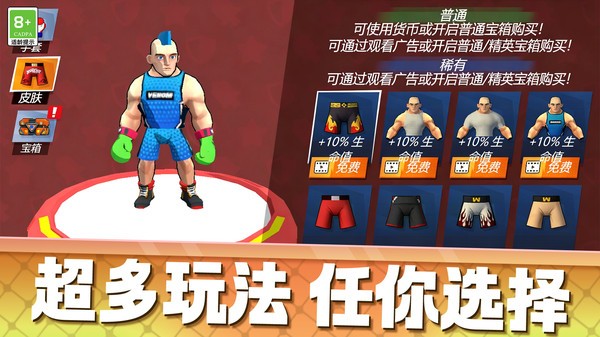 2.角色有力量、耐力、速度等多项属性,通过训练提升基础能力,再解锁更高级的拳击技能和装备。