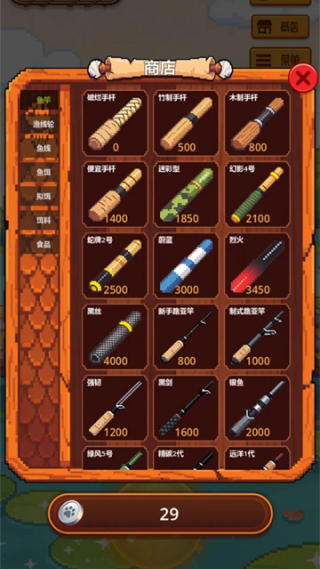 商店中可以购买钓鱼所需的各类鱼饵、渔具等道具。不同鱼饵价格各异,也可以选择低价鱼饵继续钓鱼。