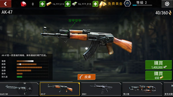 需要升级才能解锁更强力的枪支,并需要黄金购买才能使用。游戏开始送一把初始的手枪和冲锋枪,使用游戏现金升级,升级次数也是受玩家等级影响。在无法购买后续的枪支时,升级已有的枪支是不错的选择。
