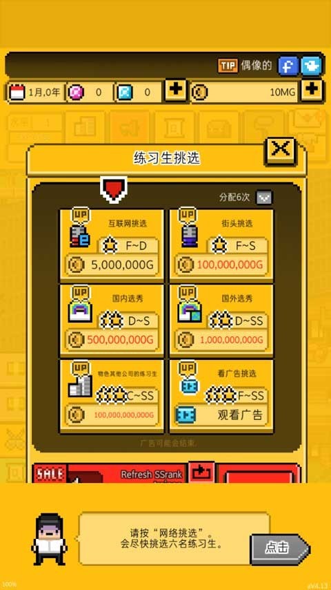 可以自己组建喜欢的男团或者是女团,在游戏中你将成为一家影视公司的老板,同时也是一名经纪人,找到优质的偶像人选,然后进行签约,这个签约时间是5年,在这期间内,一定要将他们培养成最顶尖的偶像团体。之前就说过游戏的画风不怎么样,确实,这款游戏采用的是像素风,画风自然就不会太精致,但是丰富的玩法以及各种模式,却让这款看似平凡的游戏变得好玩又耐玩,玩着玩着就停不下来