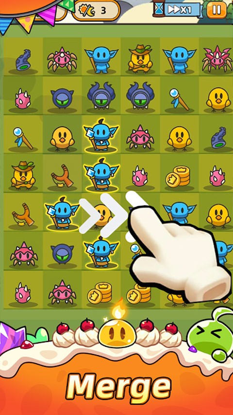 2.在限定步数内滑动合并相同怪物,每合成一级就能召唤出更强的英雄单位,它们会自动在固定位置攻击来犯的敌人波次。