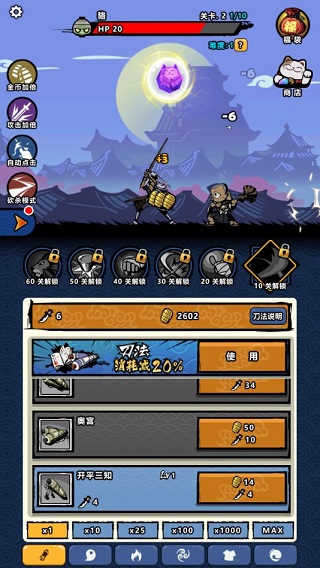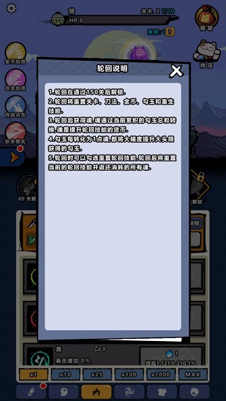 3.通过升级刀法大幅提升攻击力,通关一定阶段后解锁重生(通过75关)和轮回(通过150关)。