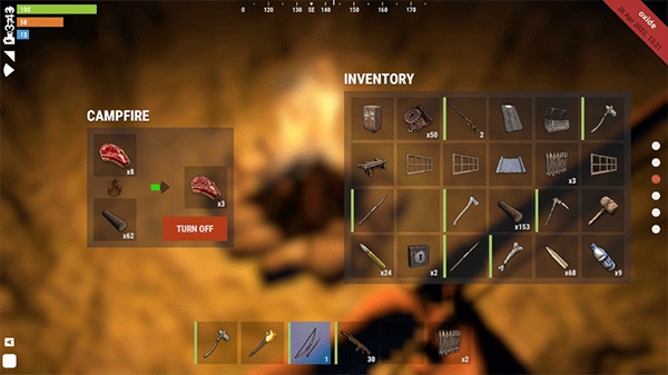 5、先找个别人不容易发现的位置,大部分是靠山边的乱石堆最理想要先制作营火堆,然后生火,生火后对着火堆选营火堆栏位,底下是燃料木头,上面cook栏位就是放生肉建议可以先把生肉分成二个二个的一小份去烤,这样可以同时烤出六个烤肉烤完肉之后,记得把火熄掉,木头、木碳都可拿走,以后会用到烤肉过程,可以顺便制造猎弓,材料是木头与布料。