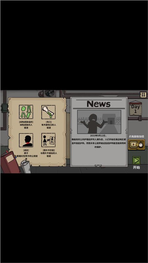 1、玩家进入游戏,首先是了解游戏背景和剧情,然后开始第一天;