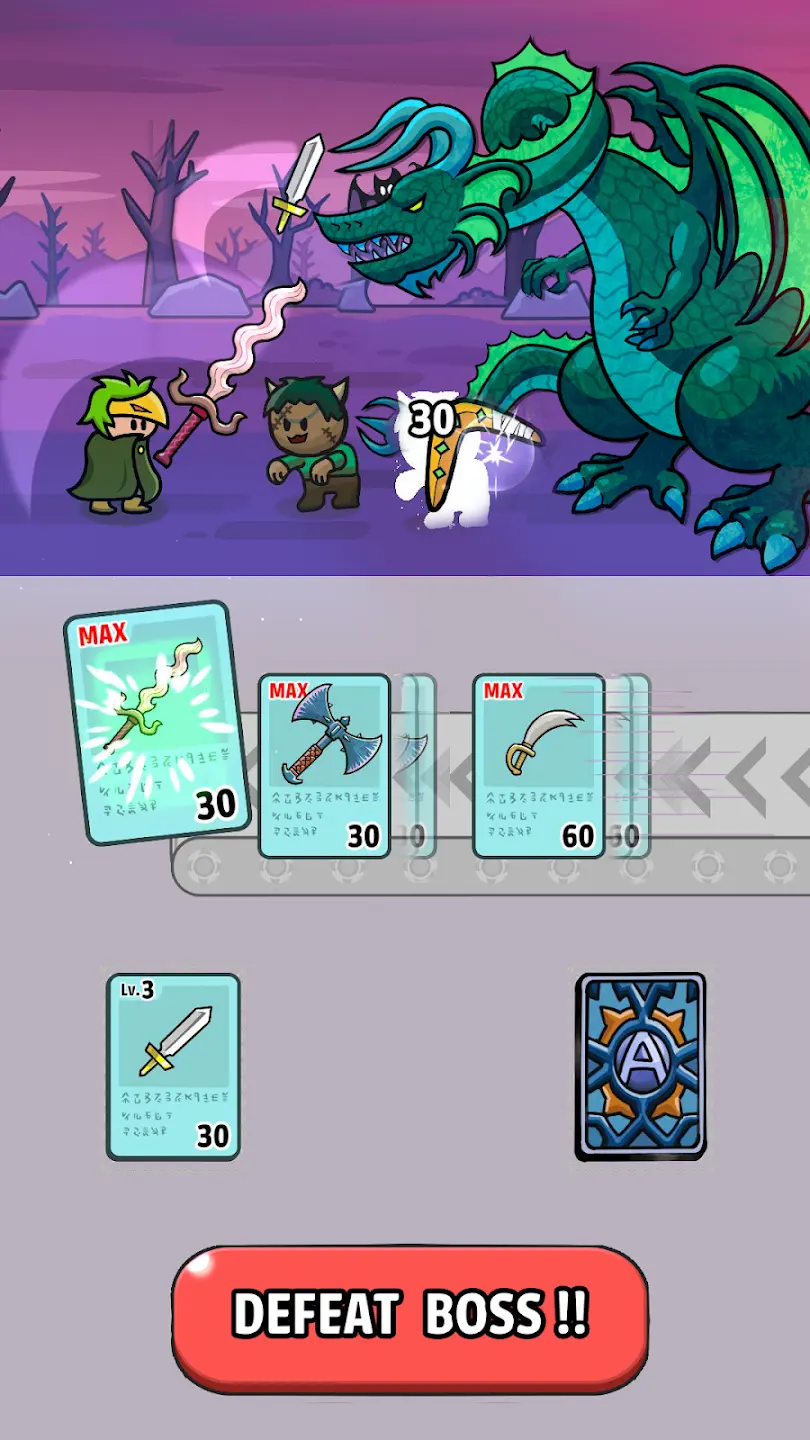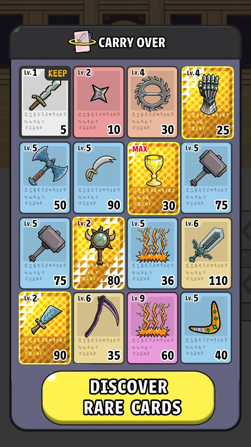 3、每一关过关后,可以将相同等级的卡牌进行合成。