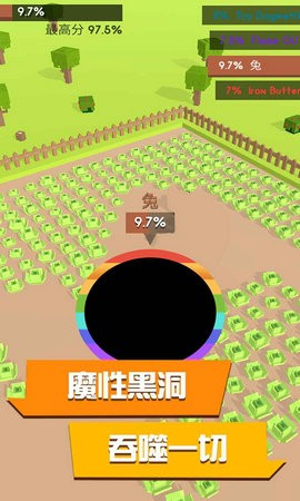 2、通过滑动屏幕将自己控制的黑洞移动进行吞噬。无敌的黑洞可以吞噬一切;