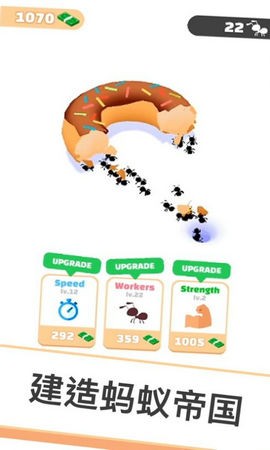 玩家不断的扩张自己的领地,吞噬许多的虫子、热狗,还有一些在建筑物,玩家可以邀请更多的蚂蚁来吞噬眼前看到的一切物品,赚取超多的金币来冒险,使用更多的手段来夺取食物,增加大量的金币吧。