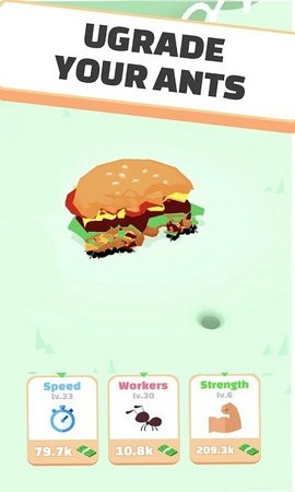 3、成为蚂蚁的大亨,为女王和主要工蚁提供服务,不断探索新的地方来获得食物,点击食物可以更快的将食物带回来;