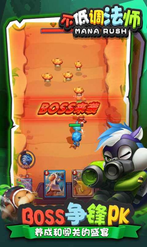 1、卡通风格策略开发手机游戏。玩家可以自由收集和升级不同的卡牌,巧妙地组合套牌组合并仔细调整技能。