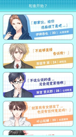 3、六位男主涵盖学生、研究员、雇员、教授等职业,性格从傲娇到温柔各具特色。