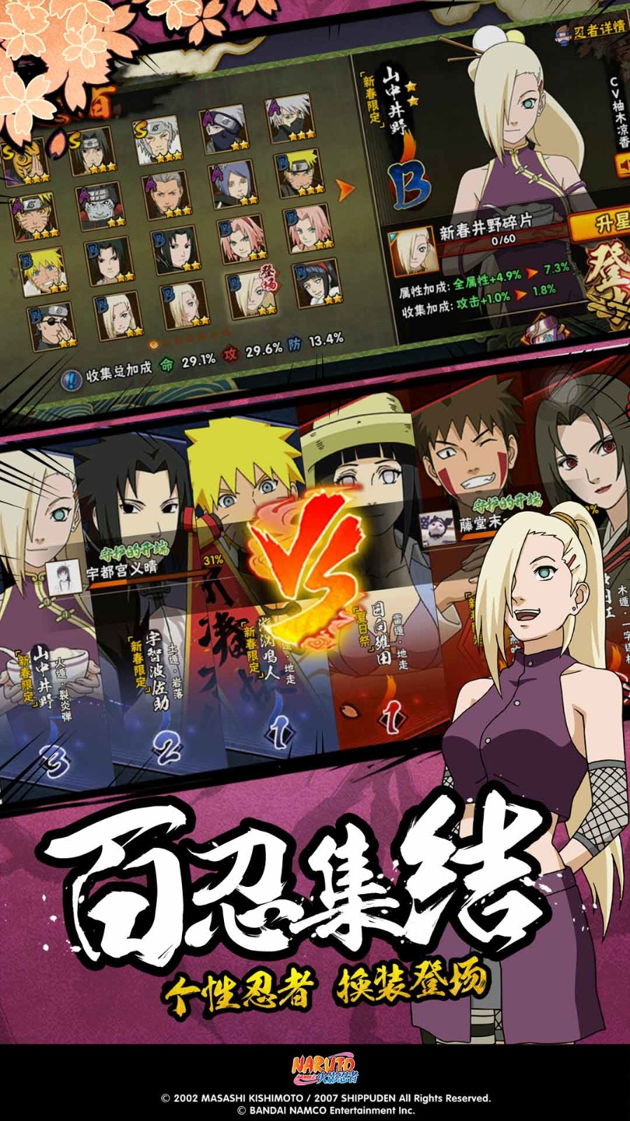 1、游戏中为玩家们准备了大量的忍者角色玩家们能够进行收集和培养,在游戏之中不断的打造自己的角色,参与到各种各样的活动之中享受更加丰富有趣的内容。