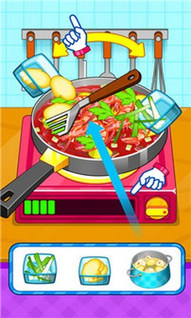 3、按照游戏的要求来进行制作,将准备好的食材进行加工,最后在平底锅将所有食材混合加热;