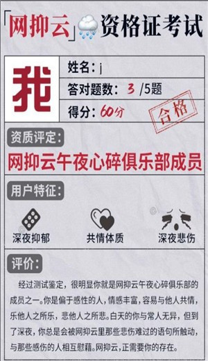 十分趣味的答题检测类休闲游戏,在文字伤感的中心,一起发觉身旁的类似,网抑云老粉絲都是说的伤感文字,从音乐下的评价收集,这次全员考試,使我们见到成人的集体性忧伤,给你资格证书吗?