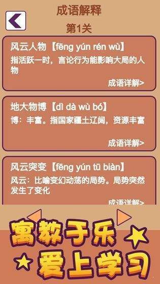 3.你也可以在游戏中学习更多的成语知识,以帮助你发展你的知识,扩大你的成语词汇量。