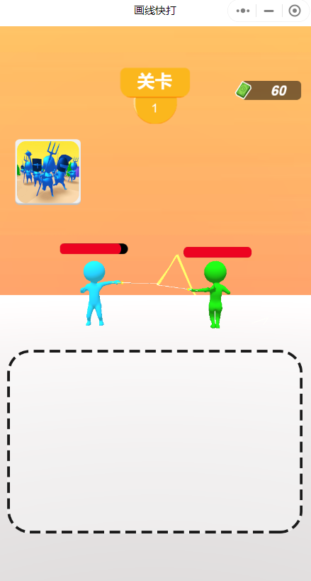 画线快打小程序是一款画线对战小游戏,玩家们可以通过绘画来指挥你的小人物开始对战,画线快打小程序中玩家们可以自由的发挥,游戏中角色的动作会根据玩家们的移动来自由的转换对战,绘画的速度越快玩家们的操控角色的动作也就越快