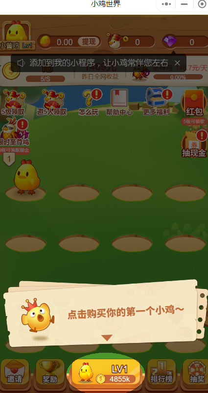 小鸡世界小程序是一款好玩的模拟休闲小游戏,游戏的画面精致的休闲经营游戏,小鸡世界小程序中玩家们可以自由的选择喜欢的小鸡经营养殖,各种精致的模式新奇好玩,享受快乐的游戏模式,收集更多的金币来兑换小红包,完成活动获得大量的道具