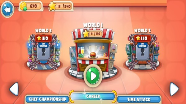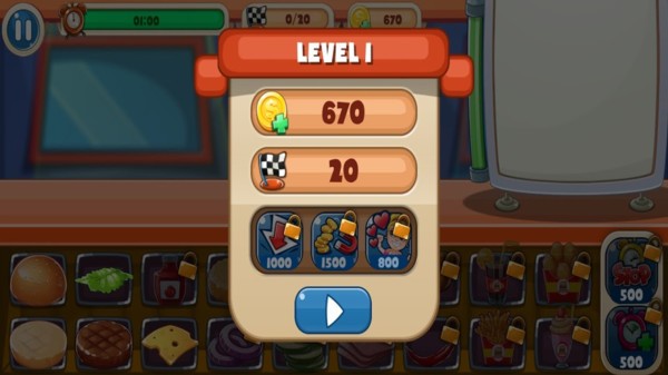 在这款游戏中,玩家扮演的是一家汉堡店的店主,通过经营一家汉堡店来实现盈利。游戏为关卡制,需要通过解锁当前关卡才能够继续进入下一关卡。每一关卡都会有一定的限时,并且会赚取一定的金币,玩家的操作表现由成功服务开心顾客的人数决定。在游戏进行之前,玩家可以通过自己赚取的金币数来升级自己的设备,加快服务的速度。