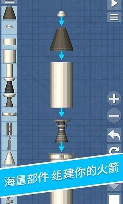 2.进入游戏后,各种火箭组件都会出现在左边,右边的列是各种调整工具,可以改变组件的方向,中间是火箭的设计尺寸。