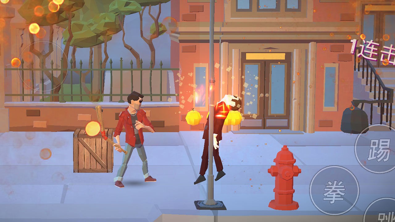 简单的键位设置就是左侧的虚拟摇杆控制方向,右侧则是单独的按钮来打出不同的连招组合,比如踢、拳、抓、跳、防,各项按钮单独放置,这样便于玩家更好的操作,每当成功挑战关卡便可获得橘子,另外进入游戏的左上方是玩家的血量,关卡的完成度以及挑战级别的难易程度。