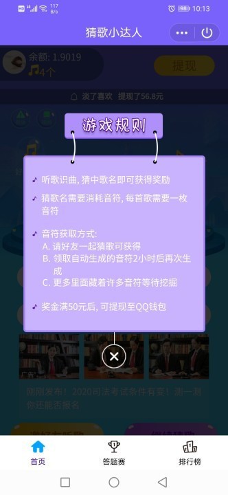 猜歌练习生小程序是一款好玩的休闲冒险对战小游戏,丰富你的大脑和思维,让你快速思考歌曲,流利地回答问题,直到你得到更高的分数,猜歌练习生小程序多种演奏方法可以让你自由体验,听音乐猜歌曲挑战节奏,整个音乐库有各种的风格选择和大量的音乐难点更加多样化,练习歌唱技巧